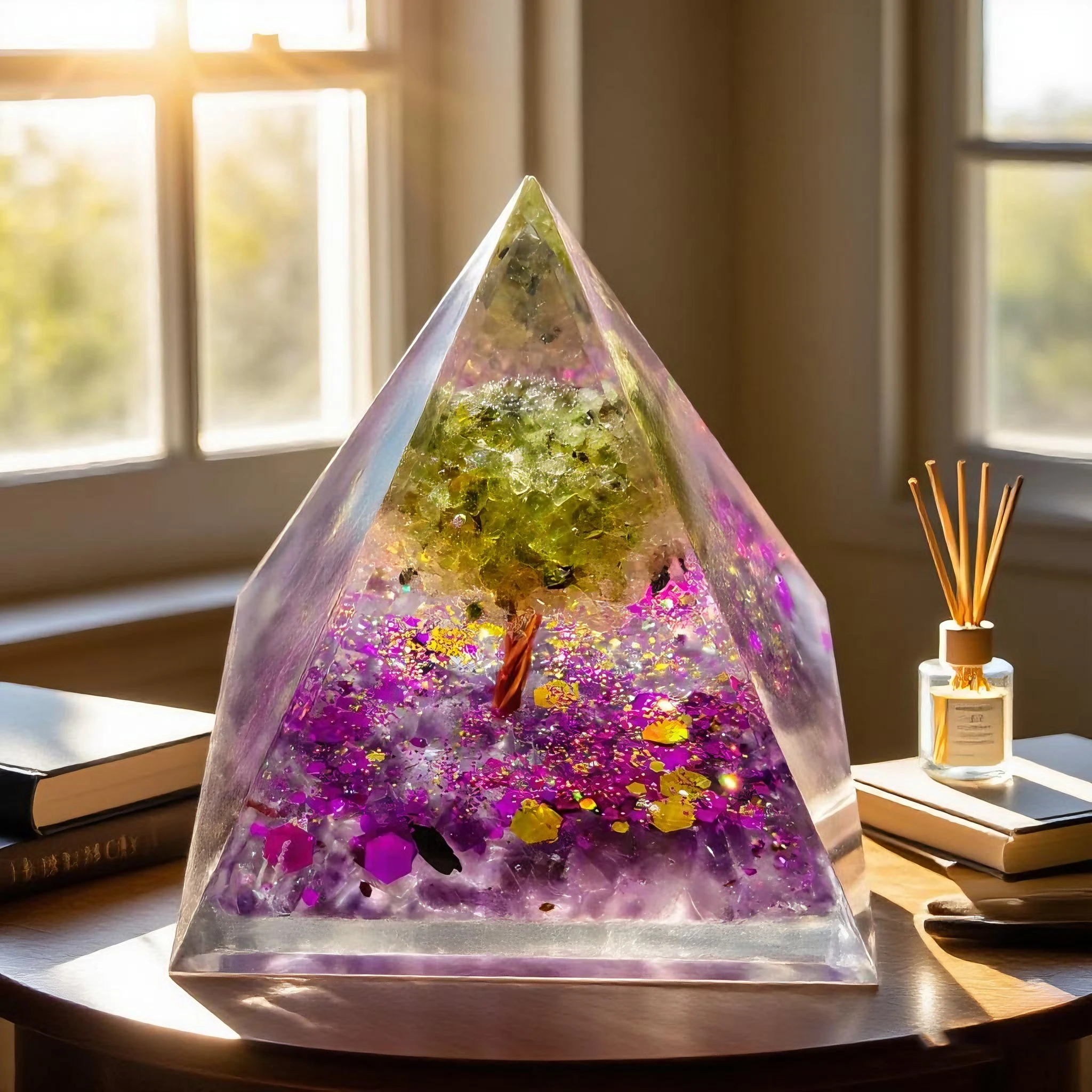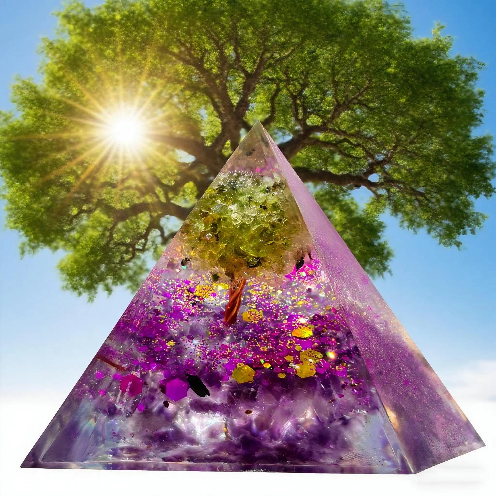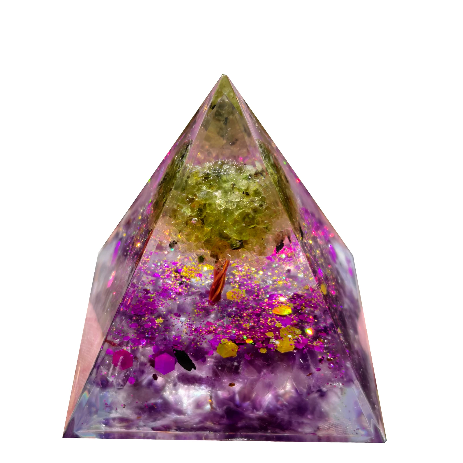 Crafted from natural amethyst and peridot, this pyramid ornament blends organic elegance with spiritual energy.