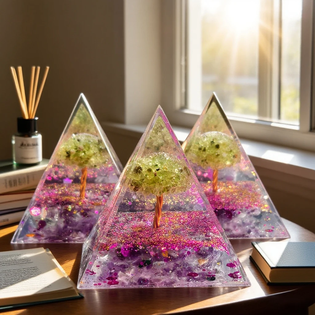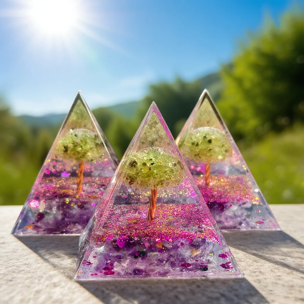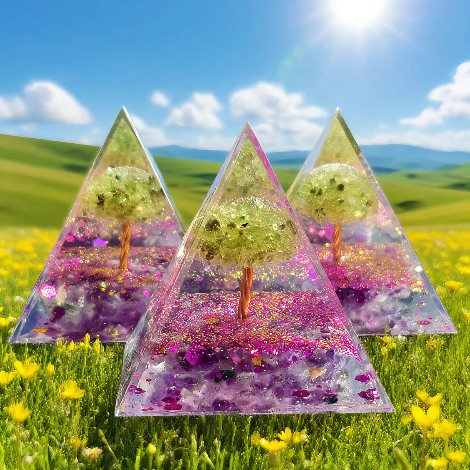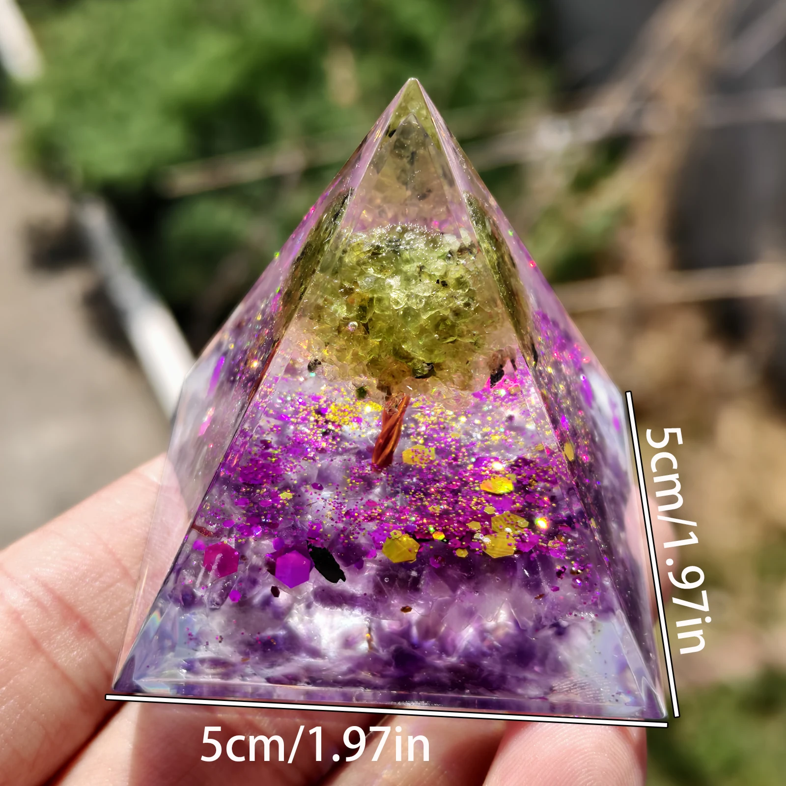 Crafted from natural amethyst and peridot, this pyramid ornament blends organic elegance with spiritual energy.