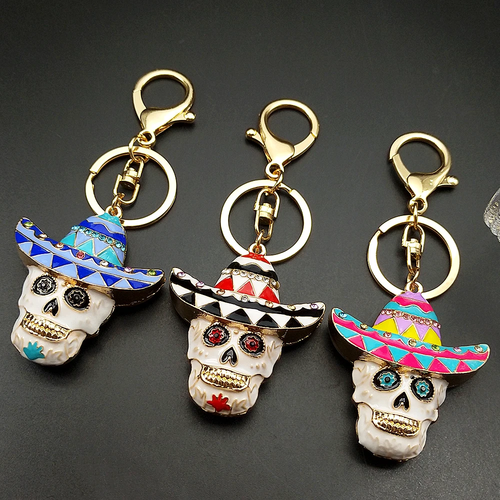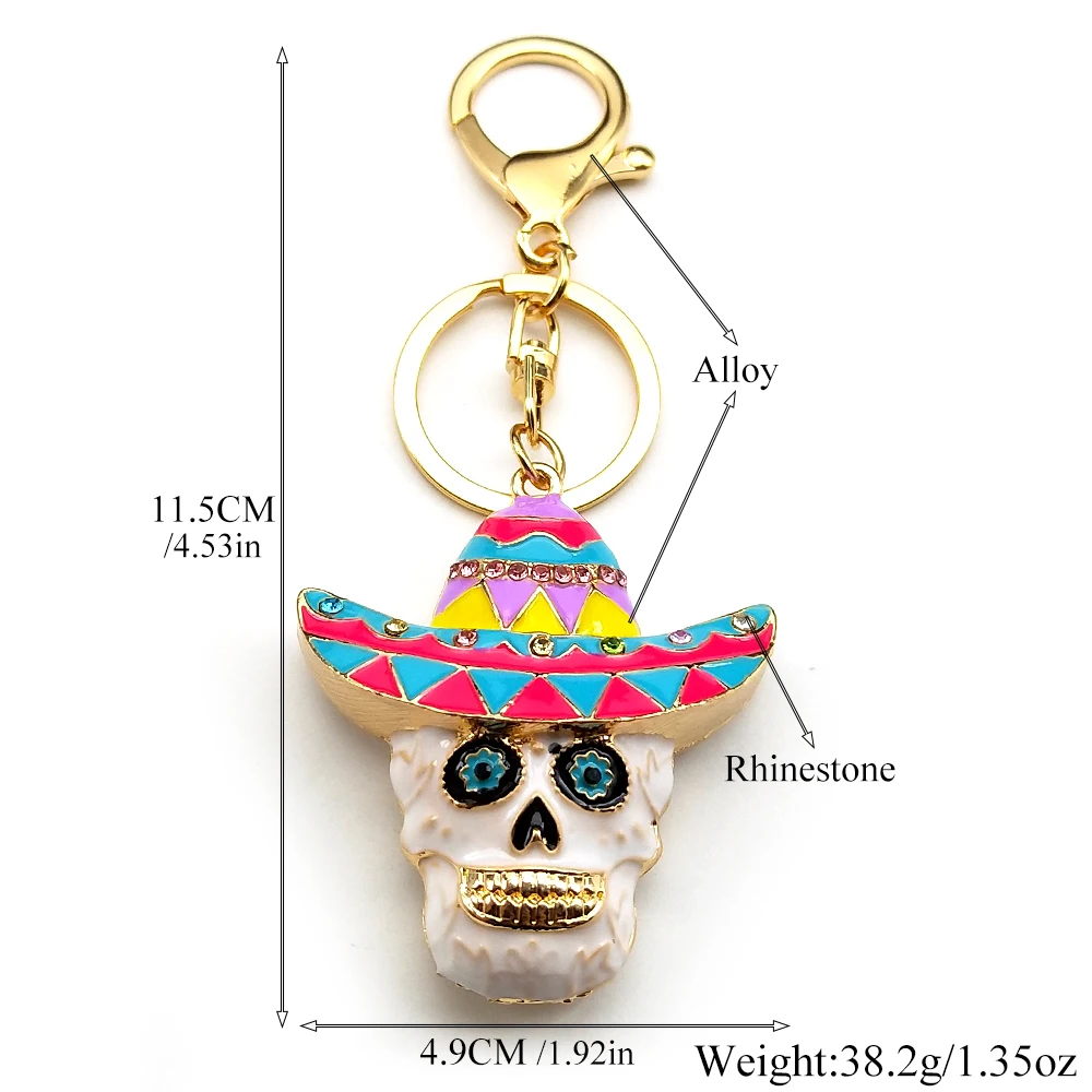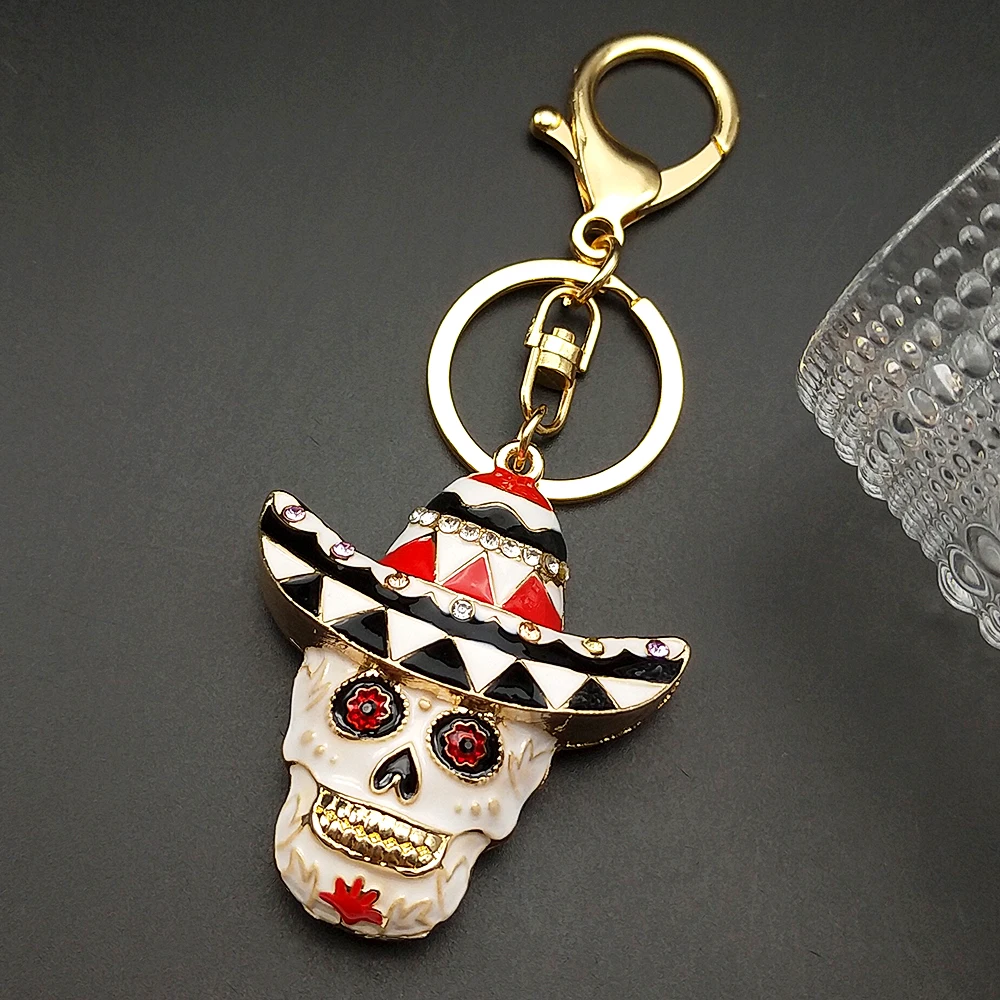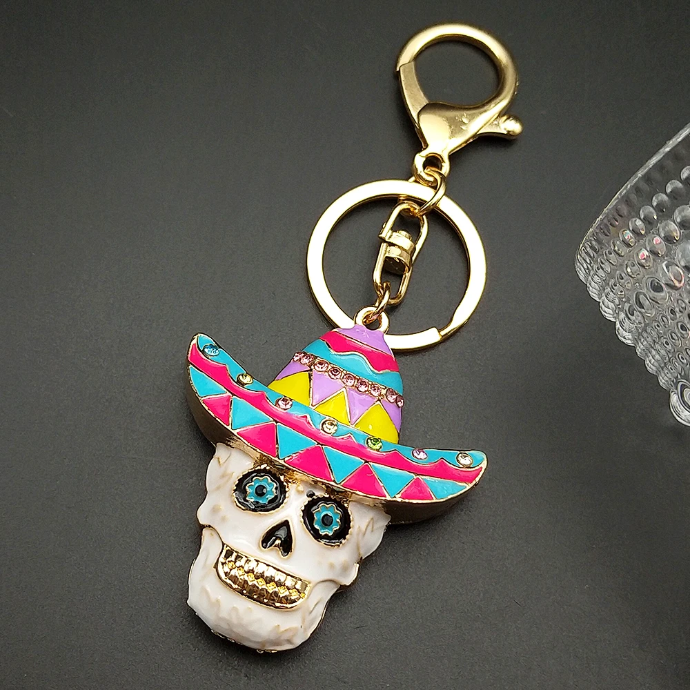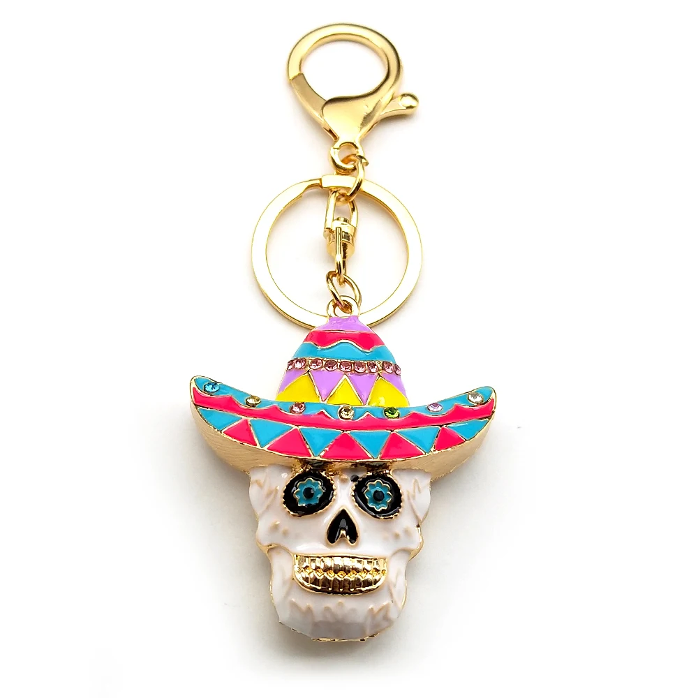 • Women Men Enamel Rhinestone Leaf Hat Skull Head Keychain Jewelry Mexican Day Of The Dead