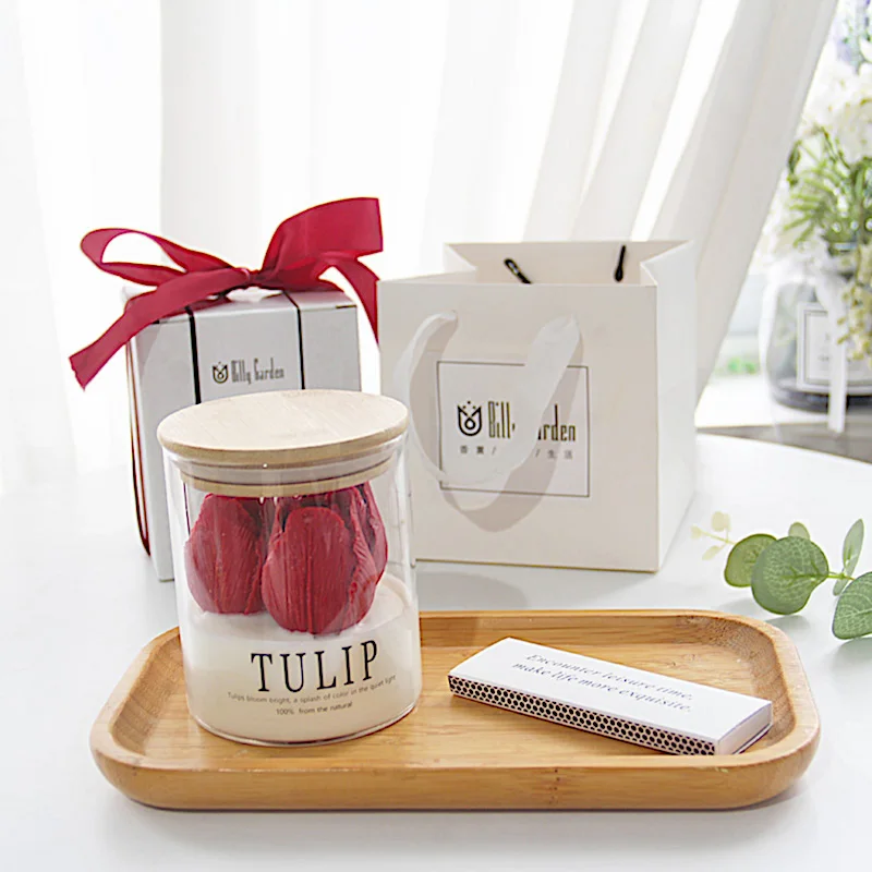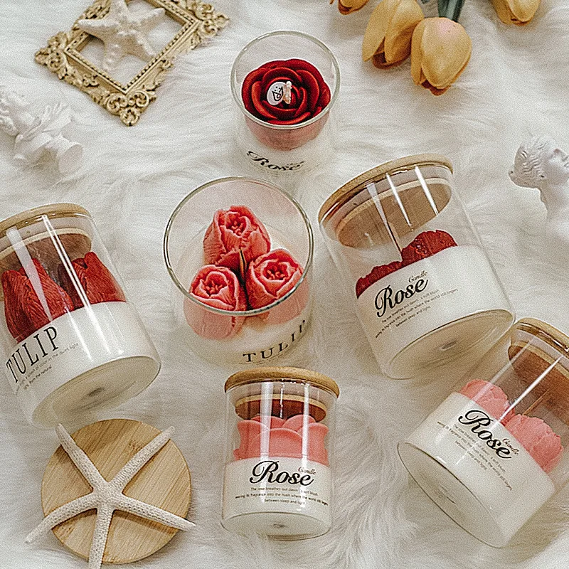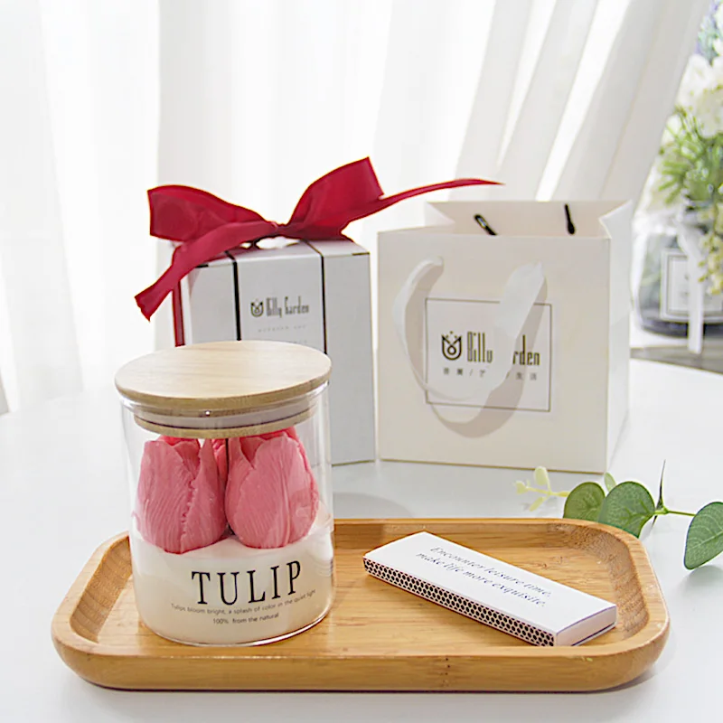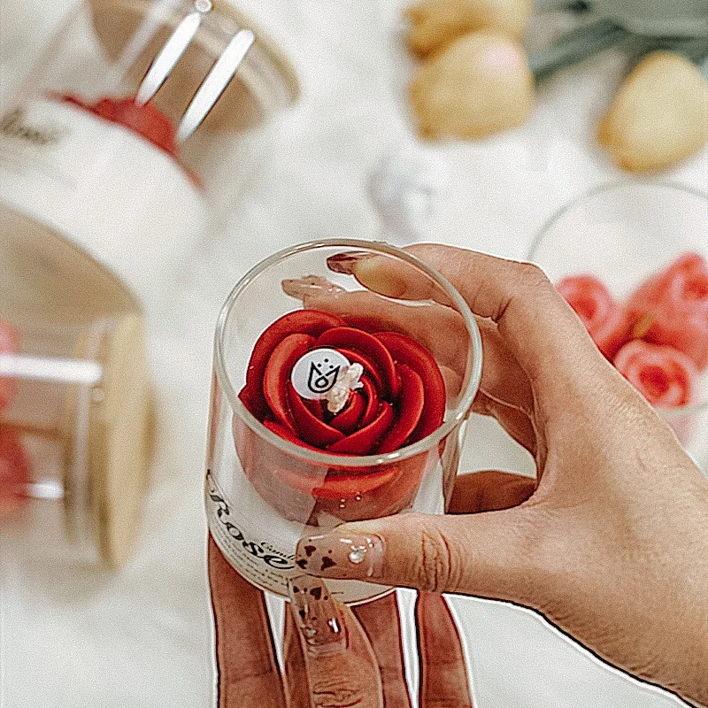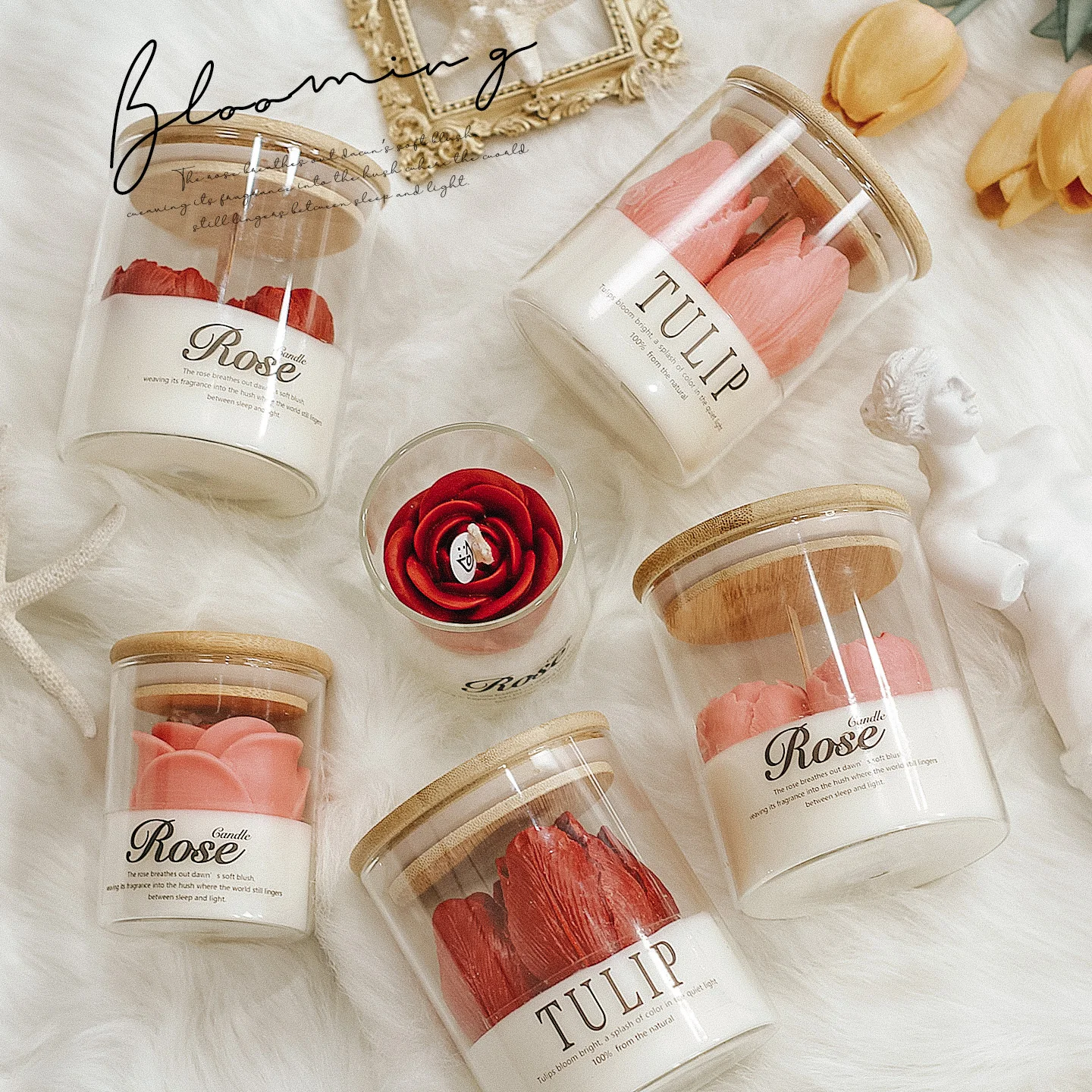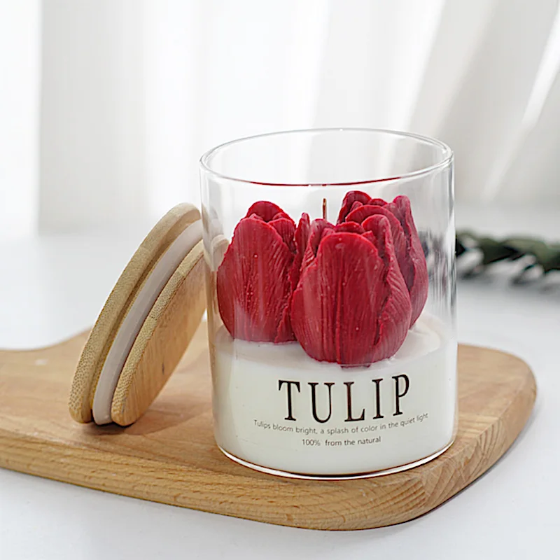 Create a romantic ambiance with this Rose Tulip Glass Candle, perfect for Valentine's Day or any special occasion.